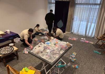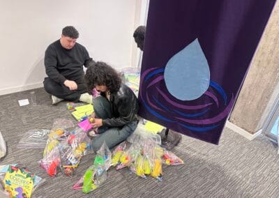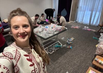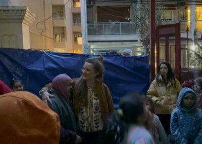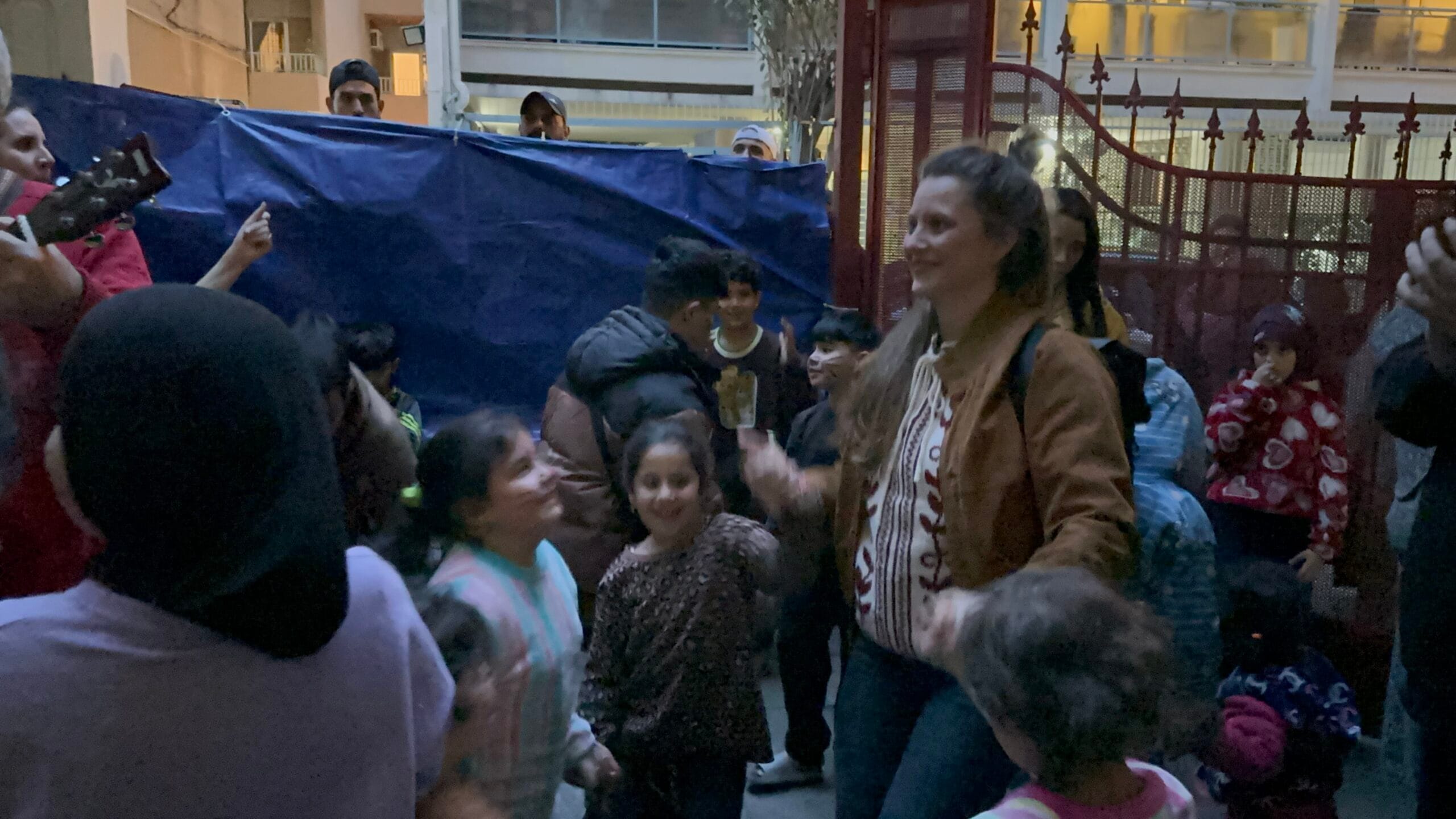 We deelden zakjes met speelgoed, pennen, kleurpotloden, schriften uit aan een grote groep kinderen die wordt opgevangen in een school wegens de oorlog.